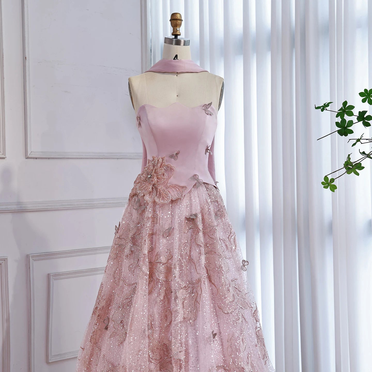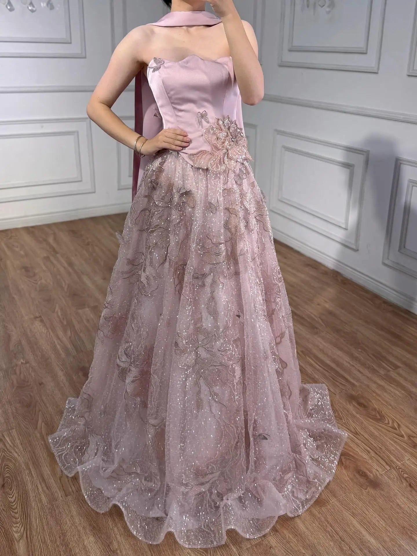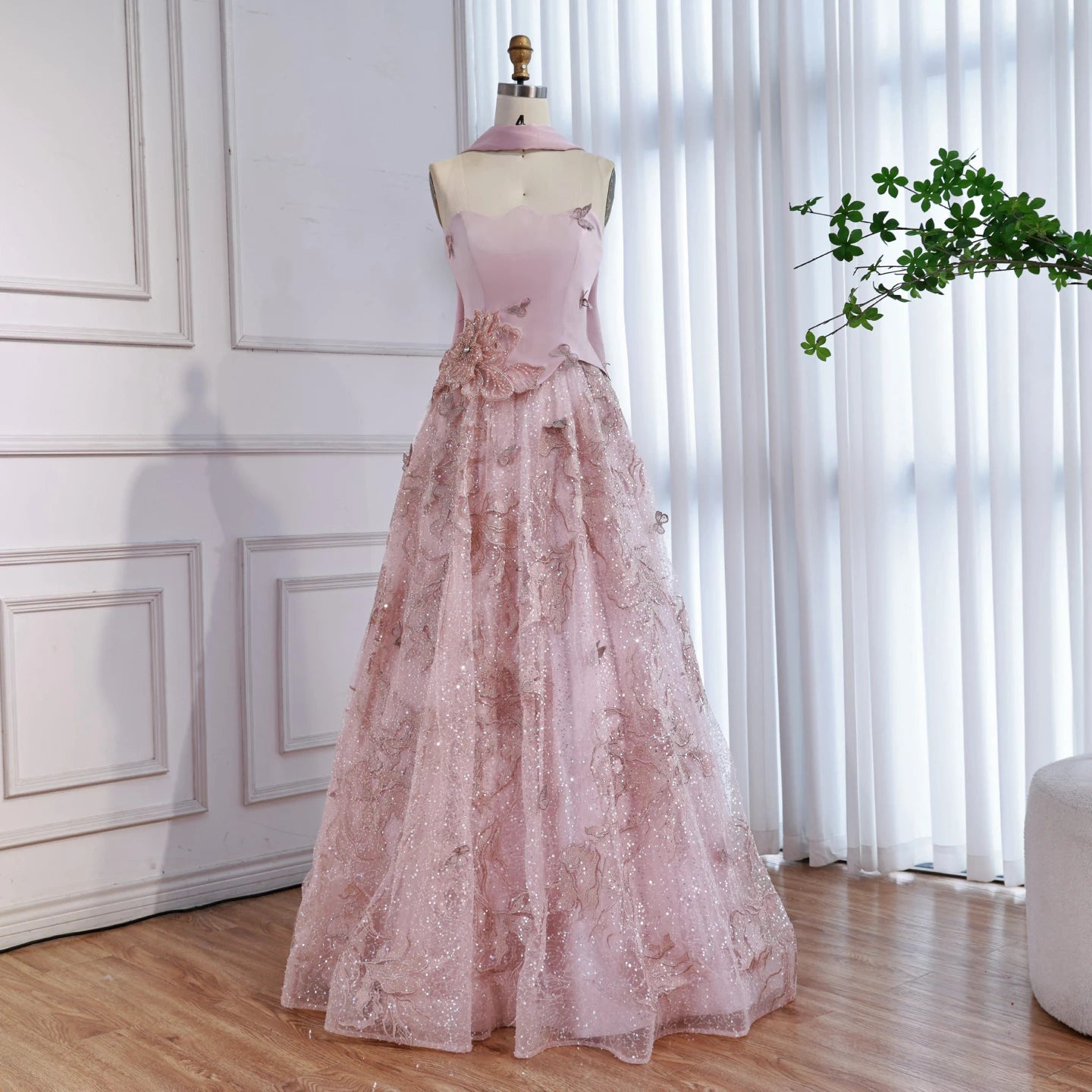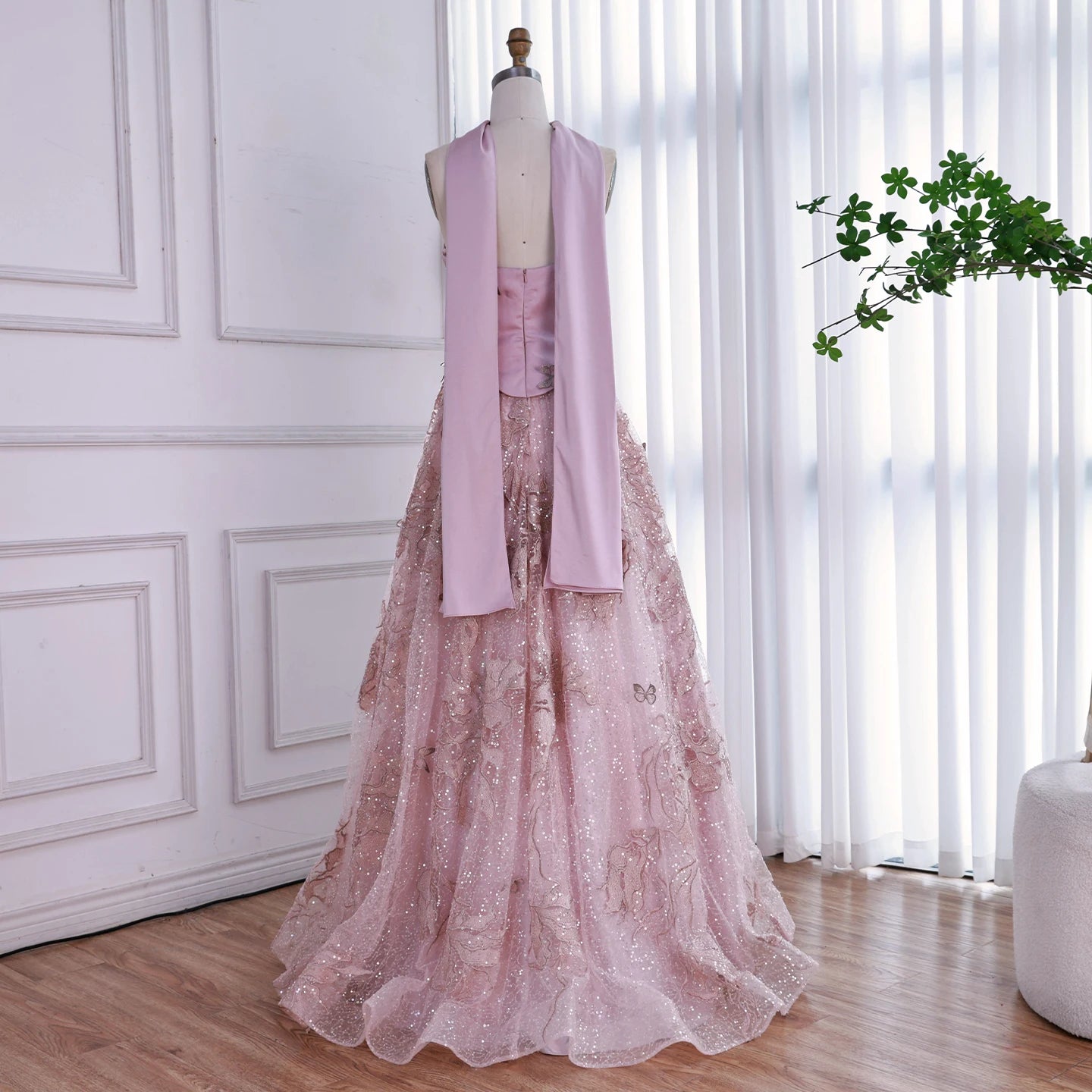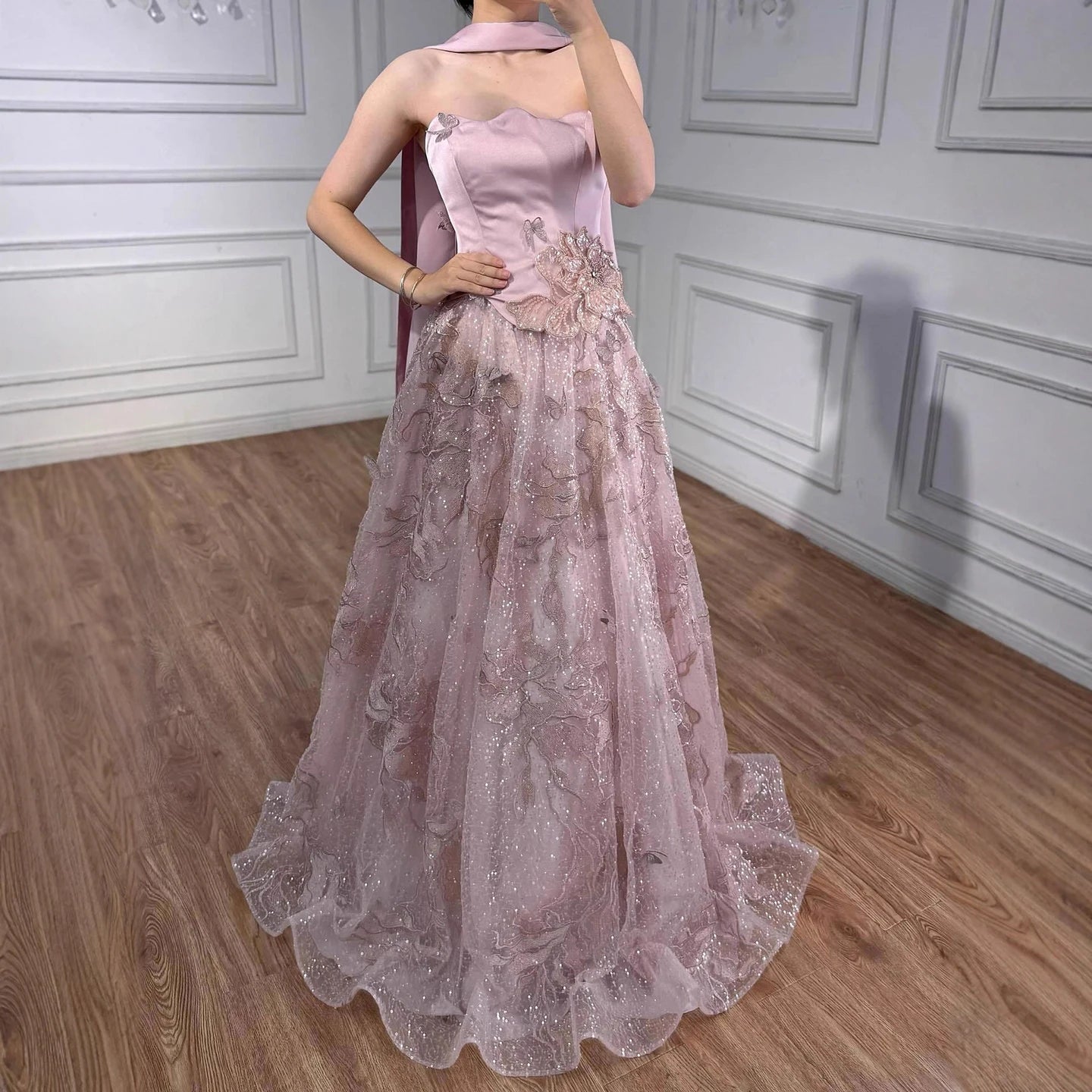 فستان سهرة فاخر وردي اللون مكون من قطعتين بتصميم A-Line مع كاب LA73415