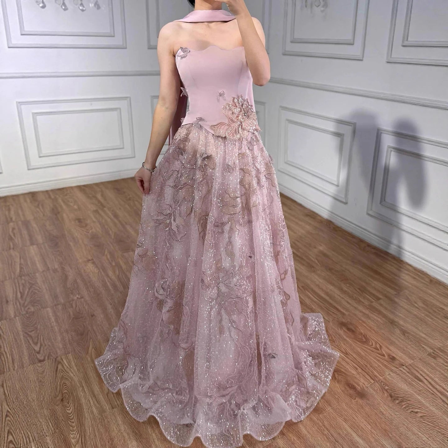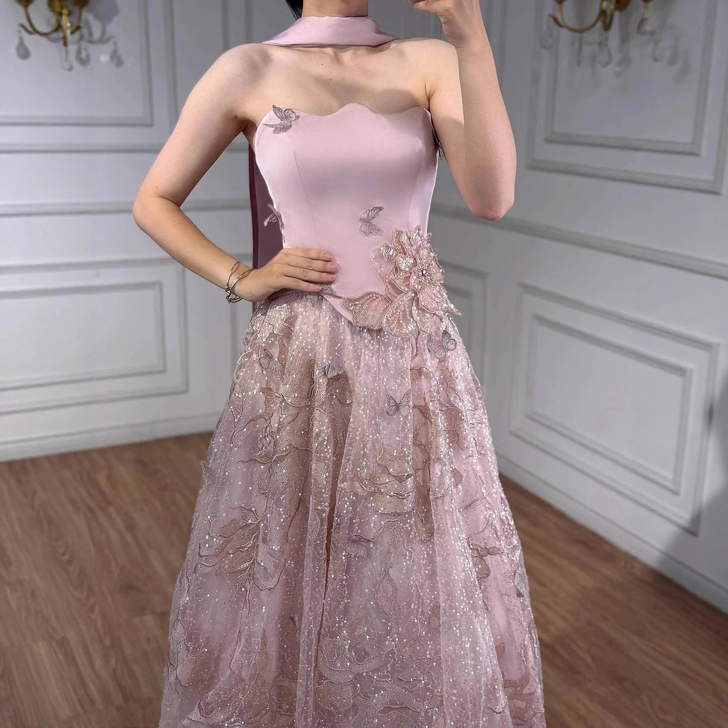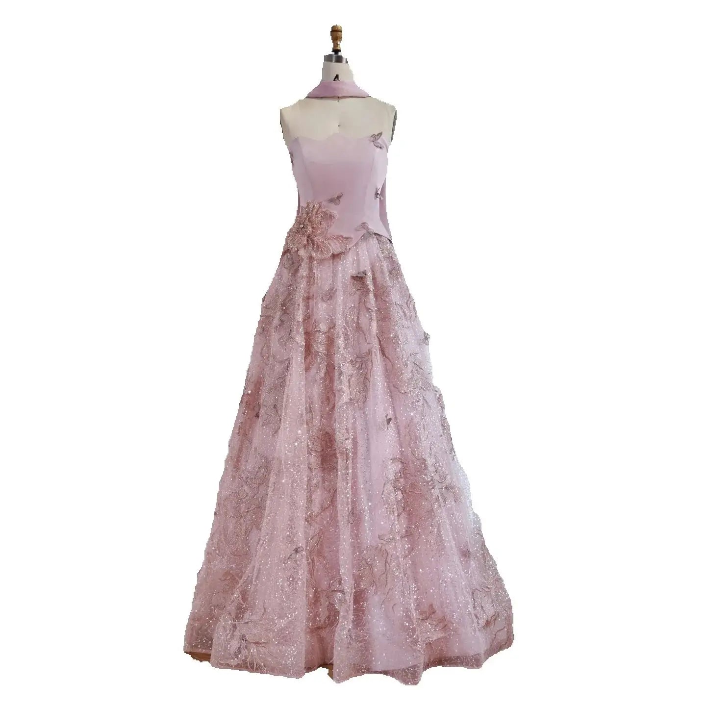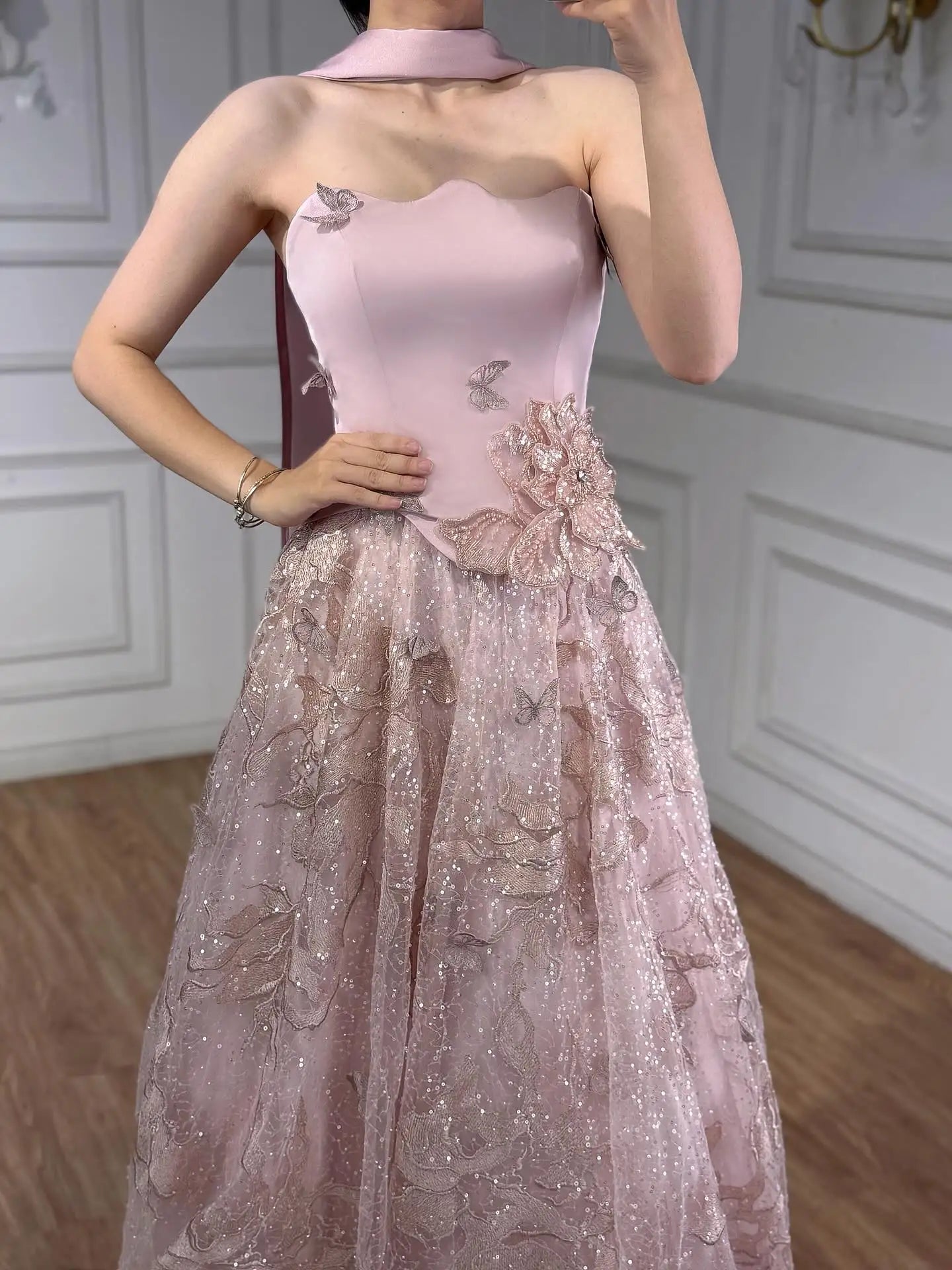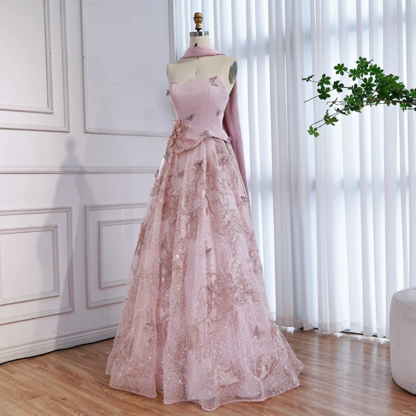 فستان سهرة فاخر وردي اللون مكون من قطعتين بتصميم A-Line مع كاب LA73415