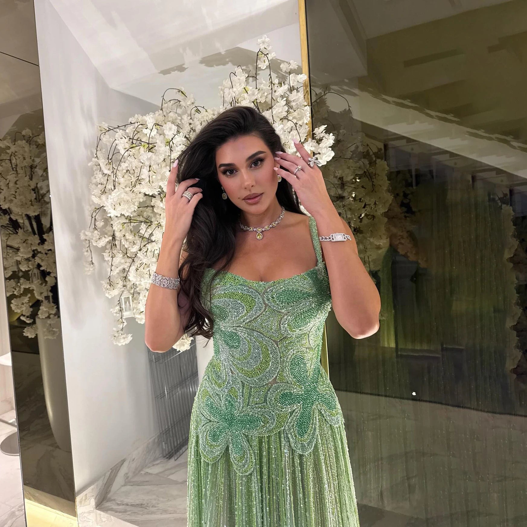 Luxury Arabic Green Beaded Spaghetti Strap Evening Dress, LA73332. Elegant Style Perfect For Wedding Guest, Party, And Evening Occasions.
