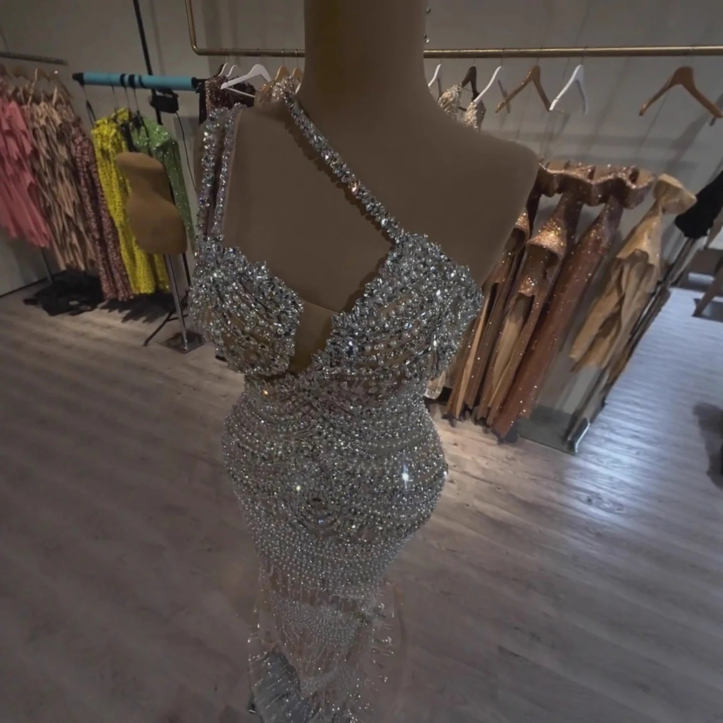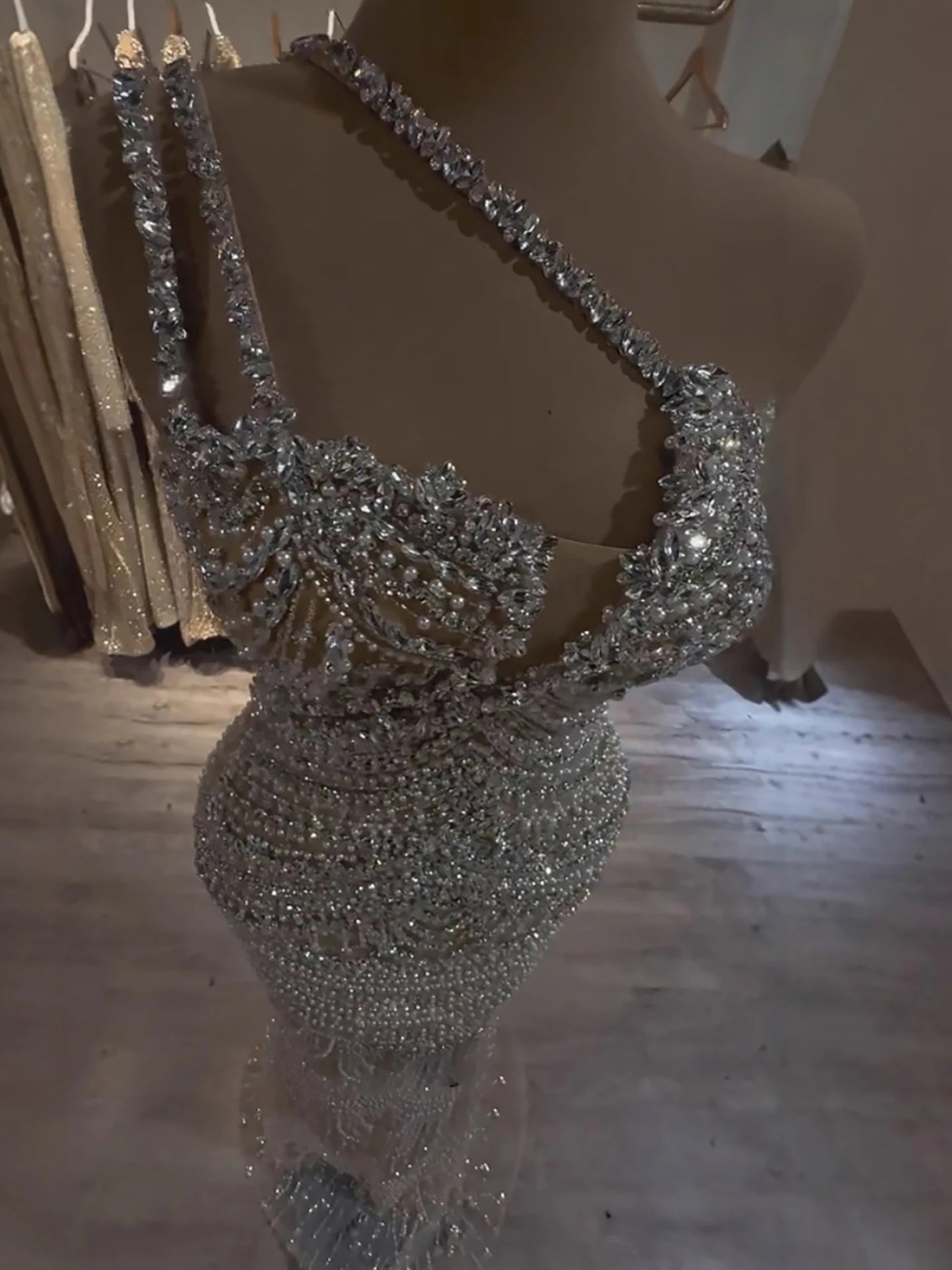 Luxury silver nude one shoulder Pearls beaded evening dress LA73371. Elegant mermaid silhouette for wedding party and formal events in 2026.
