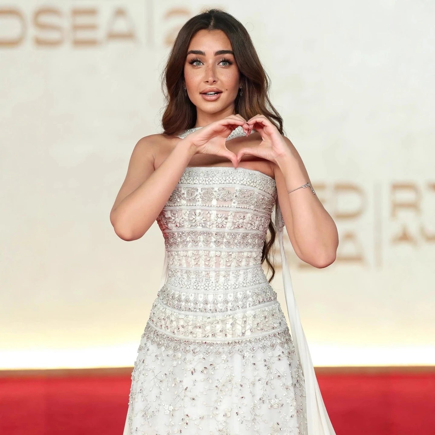 White Crystal Beaded Strapless Evening Dress With Elegant Cape, LA73334. Perfect For Red Carpet And Special Evening Occasions.