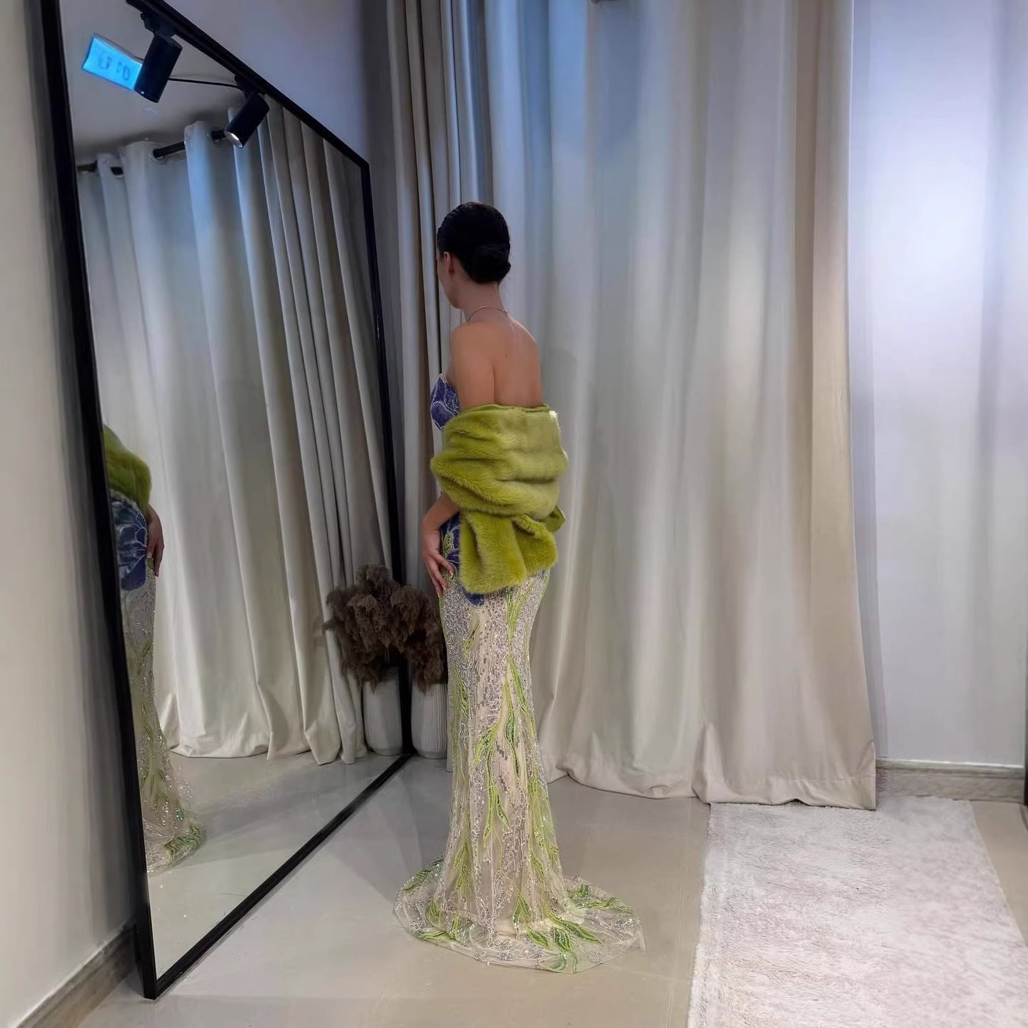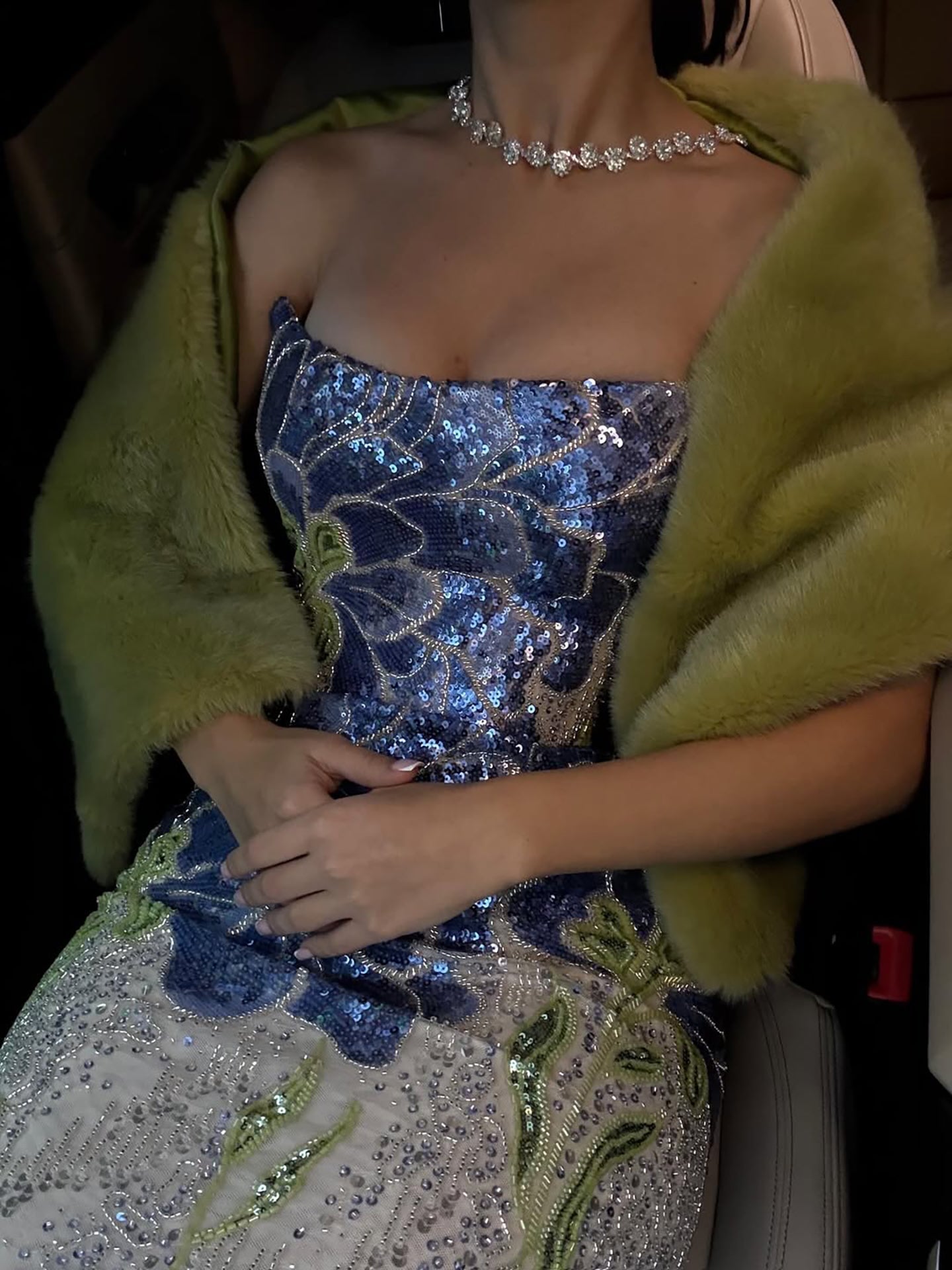 Luxury blue strapless mermaid evening dress with intricate beaded embroidery and illusion tulle. Elegant fitted silhouette for formal occasions.