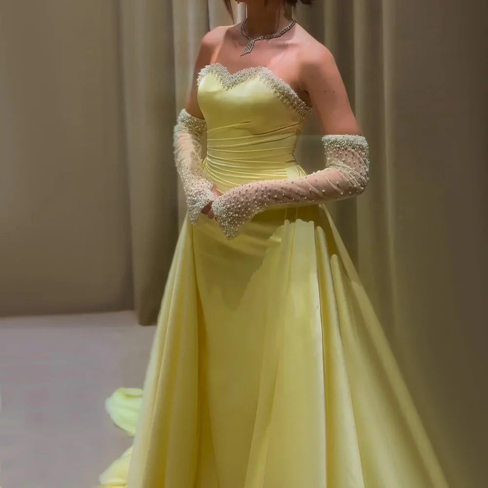 Elegant Yellow Mermaid Beaded Evening Gown with Detachable Sleeves LA72777