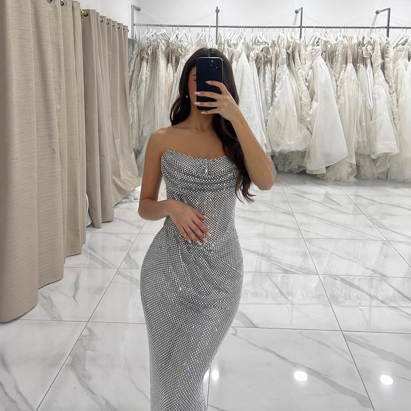 Luxury silver strapless mermaid evening dress with full beaded details and a sleek silhouette, perfect for any formal occasion, weddings, or special events. LA73410A