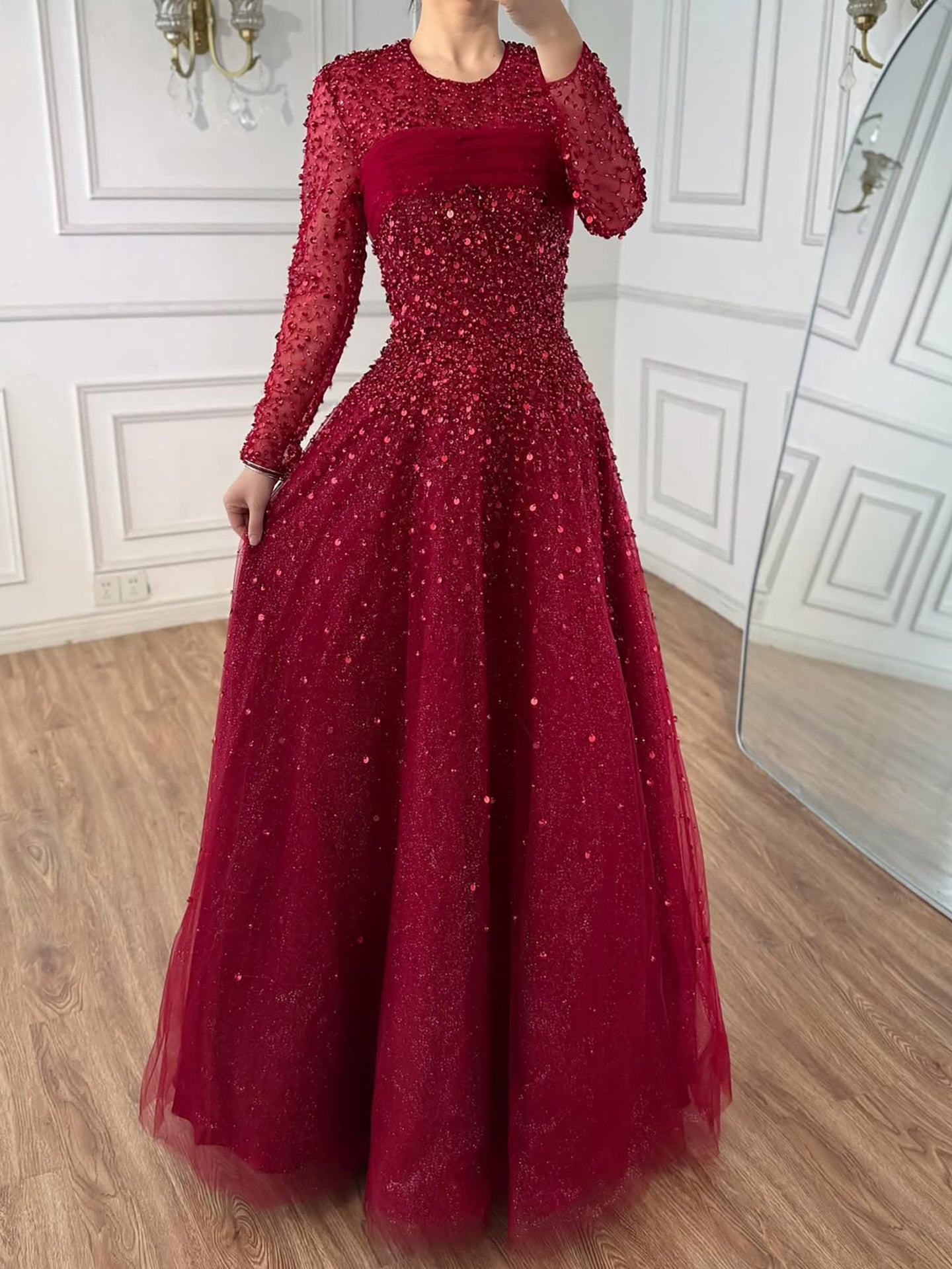 Luxury Arabic Blue O-Neck Beaded A-Line Evening Dress with Long Sleeves LA72009B