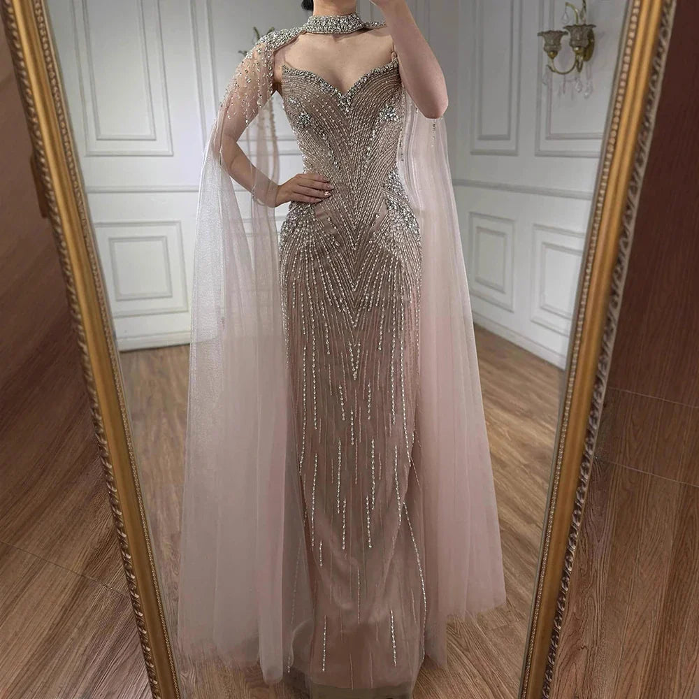 Luxury Arabic Nude Beaded Evening Dress with Cape Sleeves LA73173