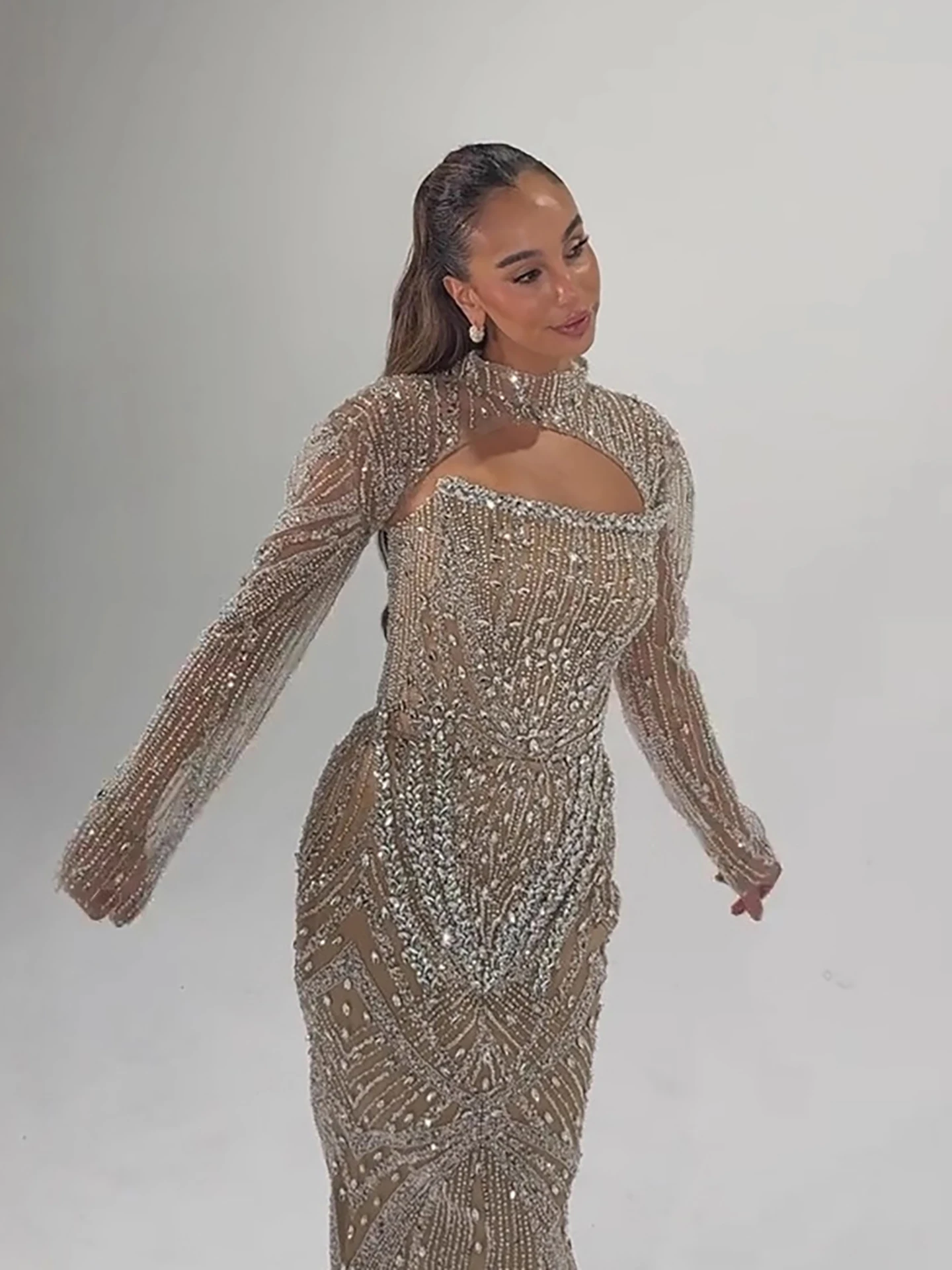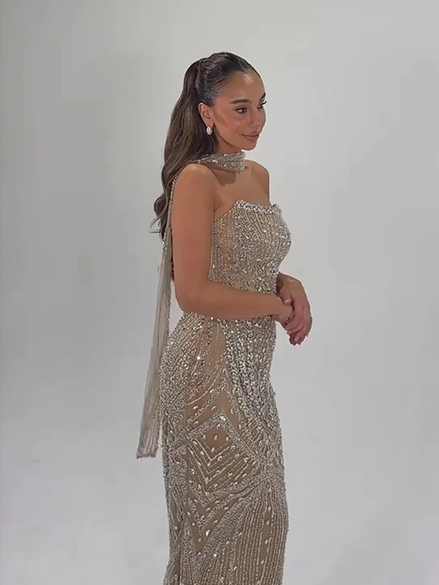 Luxury Arabic nude crystal beaded mermaid evening dress with elegant jacket, perfect for formal occasions and parties. Model LA73376.