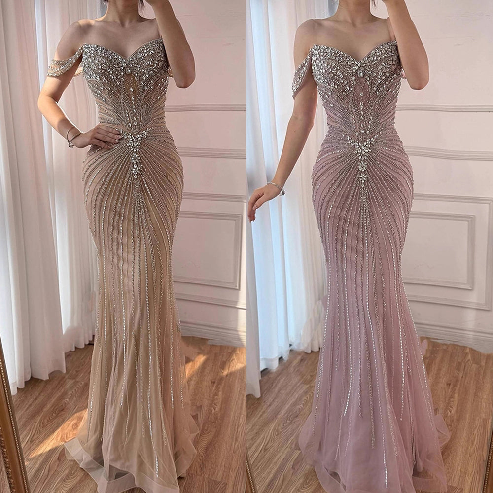 Luxury Arabic Nude Crystal Off Shoulder Beaded Mermaid Evening Dress LA73128A