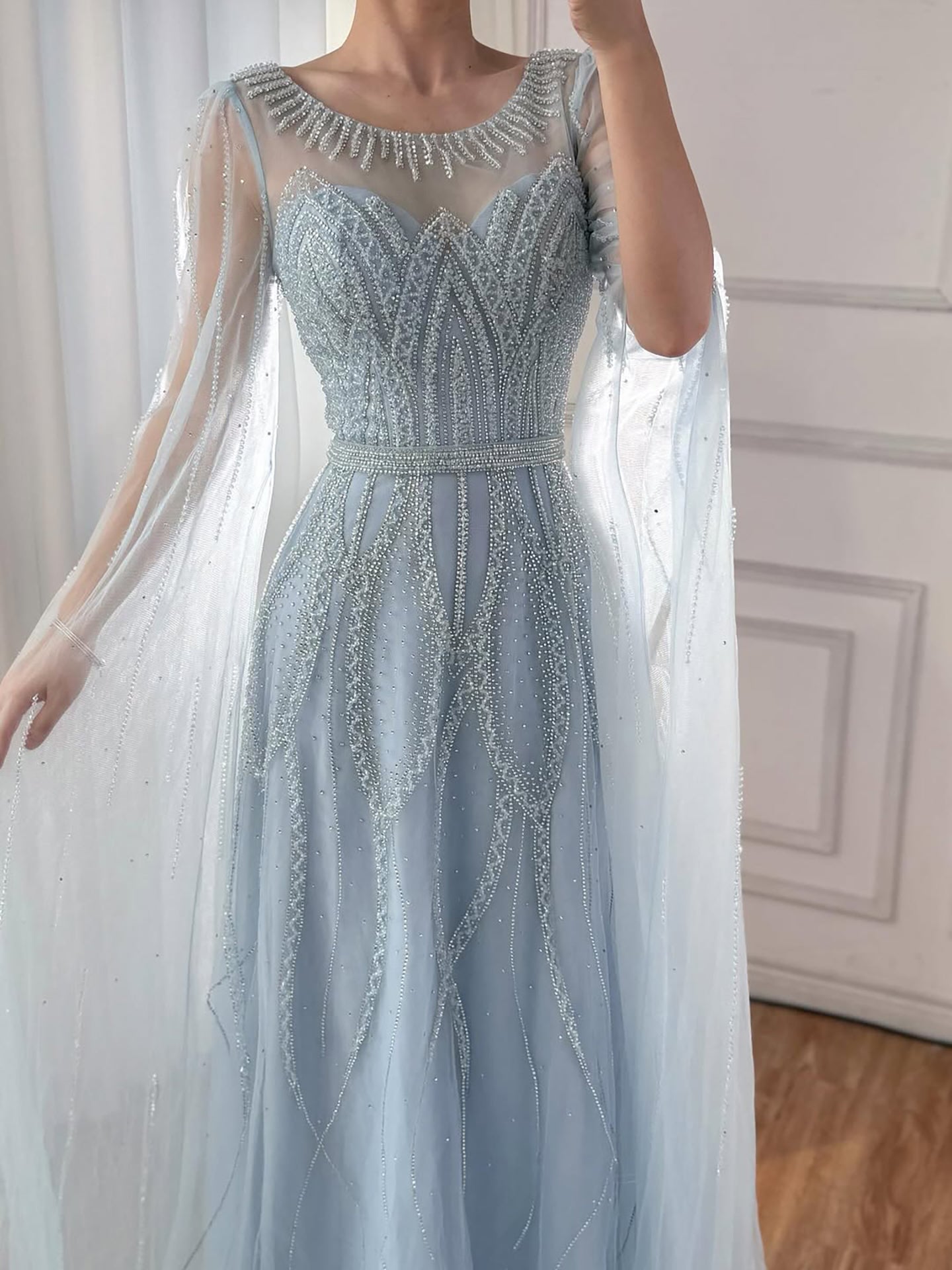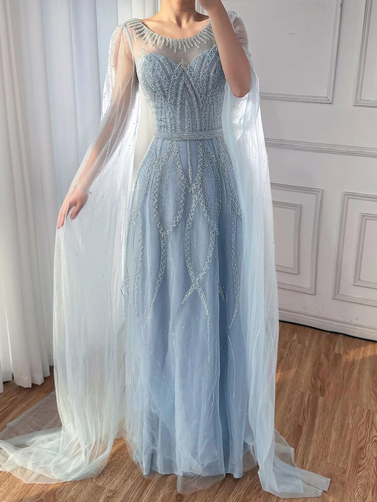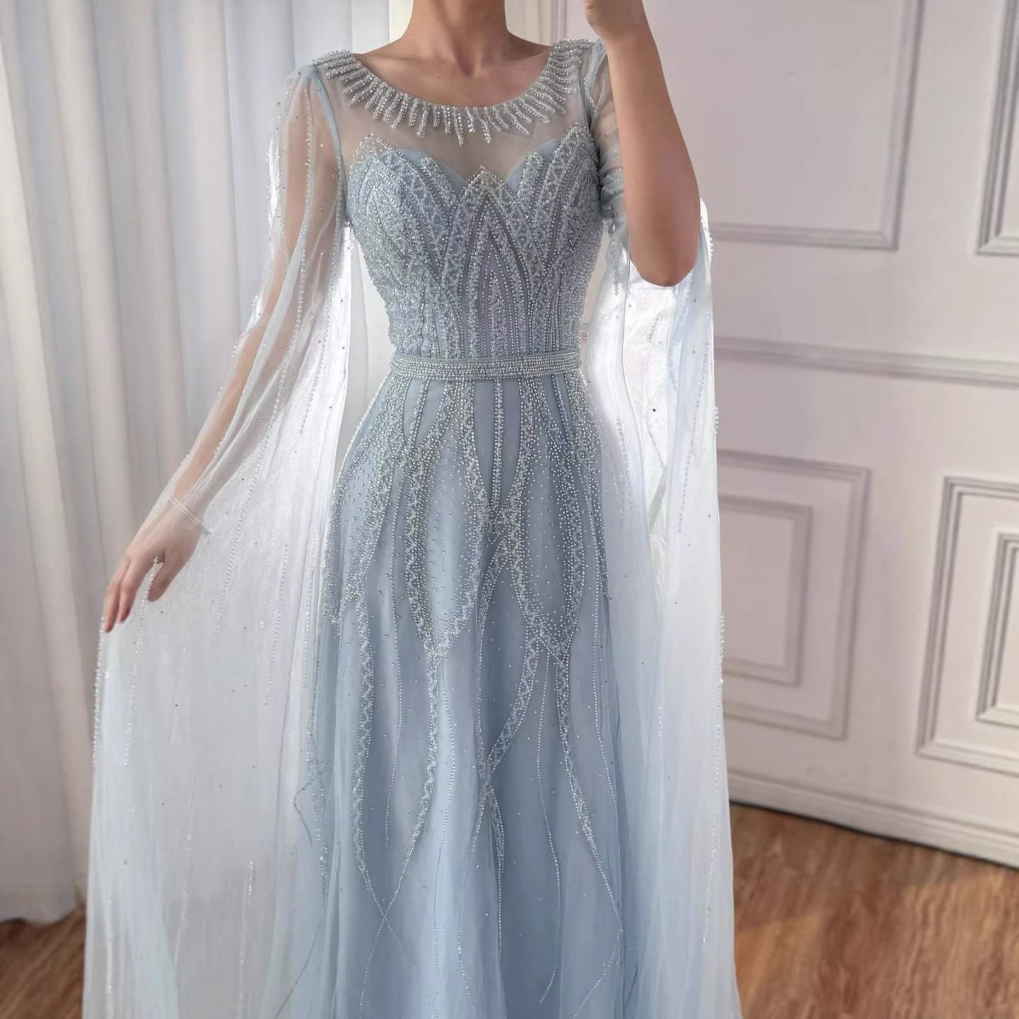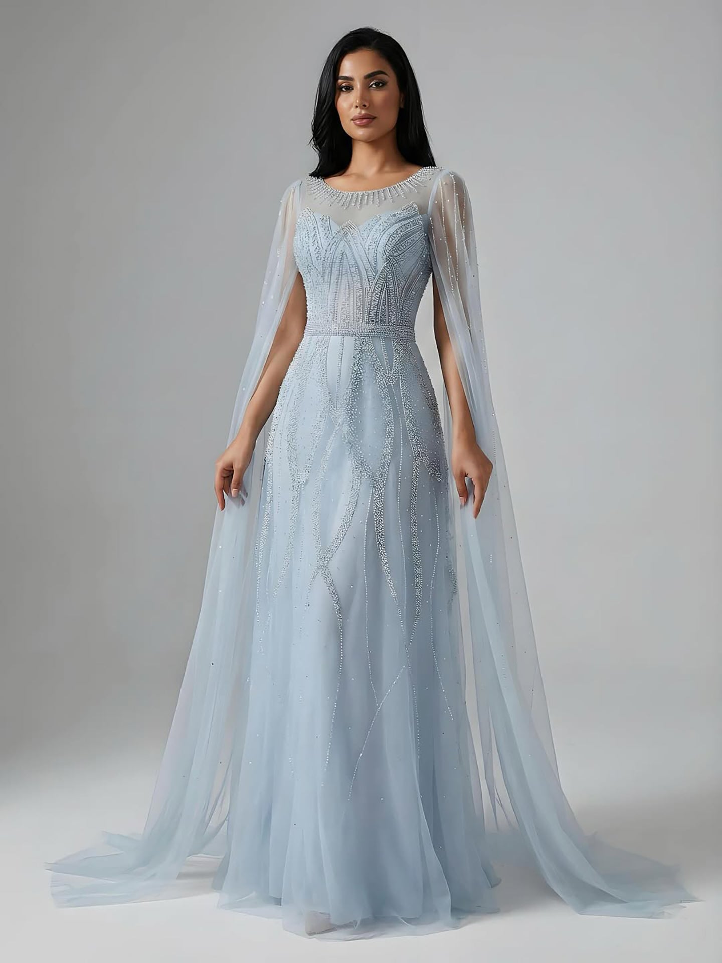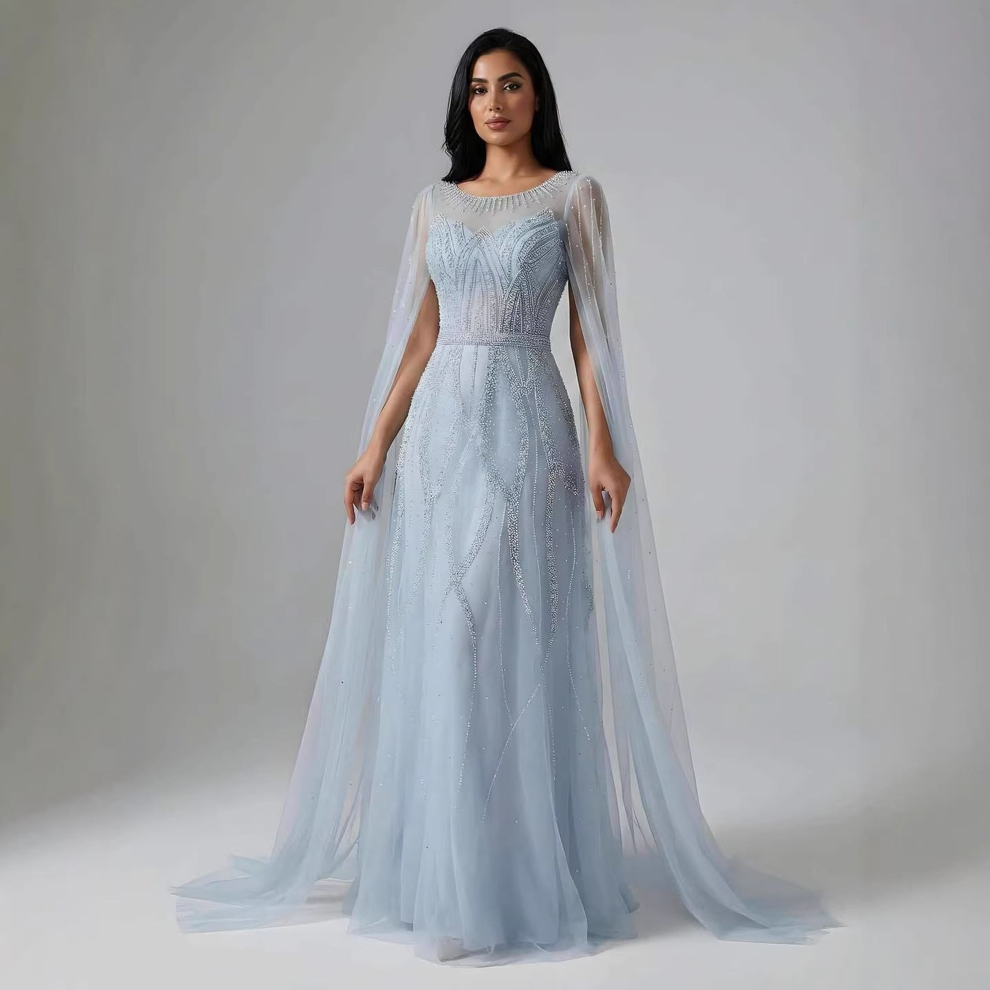 Luxury black A-line Arabic evening dress featuring elegant beadwork and cape sleeves. Perfect for formal occasions, weddings, and evening events.