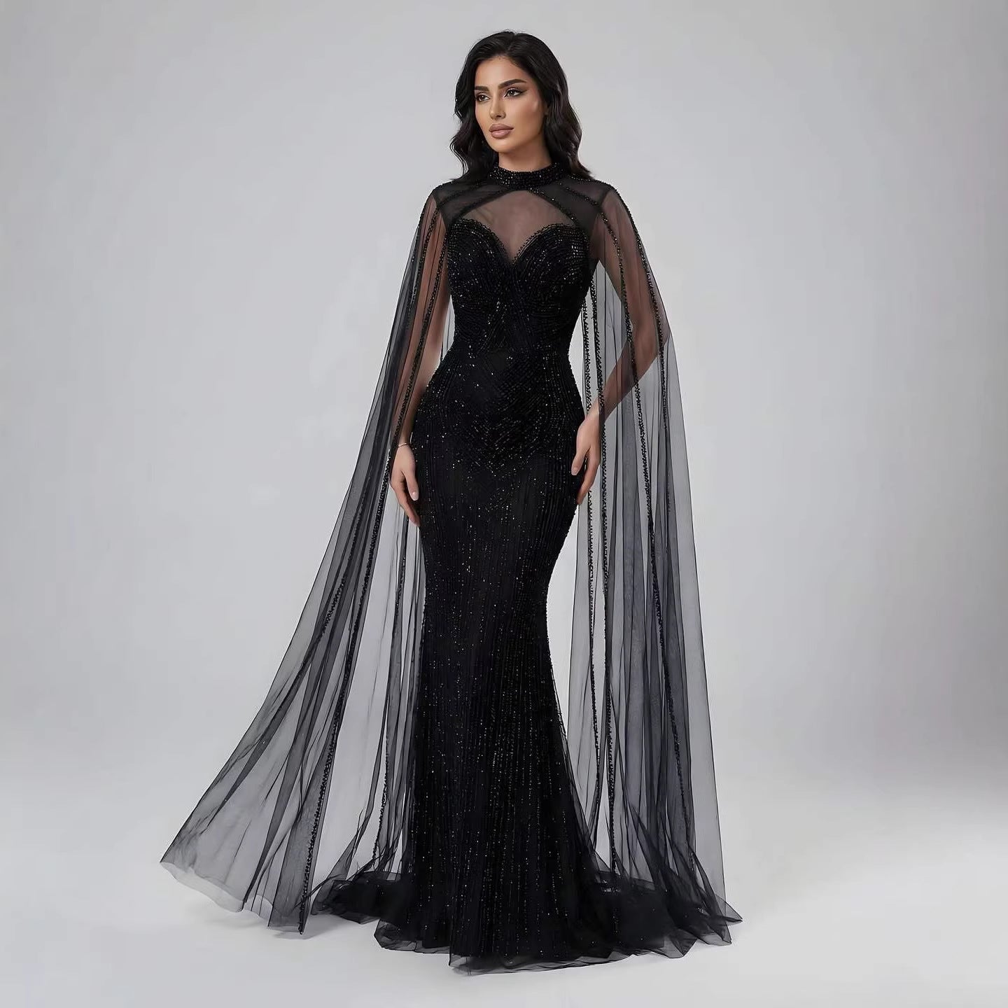 Luxury caramel beaded mermaid evening dress with elegant cape sleeves, featuring a fitted silhouette for weddings, parties and formal occasions.