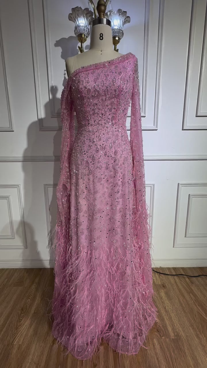 Luxury Feather One Shoulder Evening Dress with Cape Sleeves LA72763