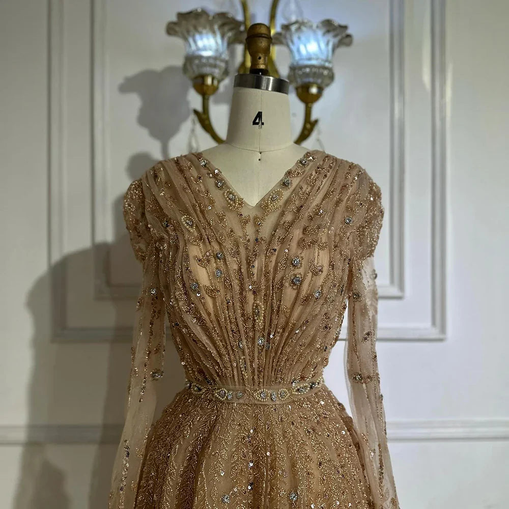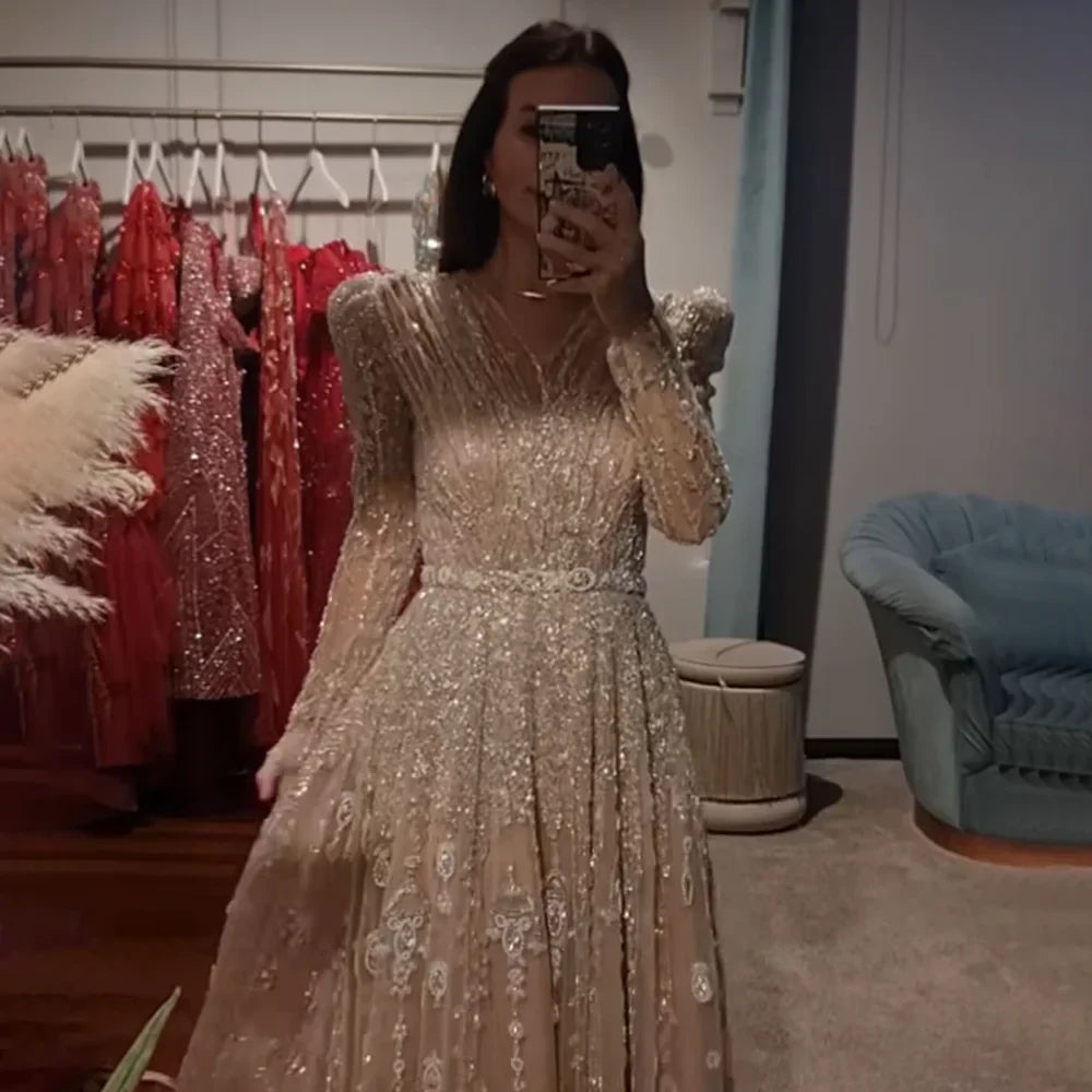 Elegant nude A-line evening dress with delicate beading, inspired by Dubai and Saudi Arabic style. Perfect for galas, weddings, and formal occasions.