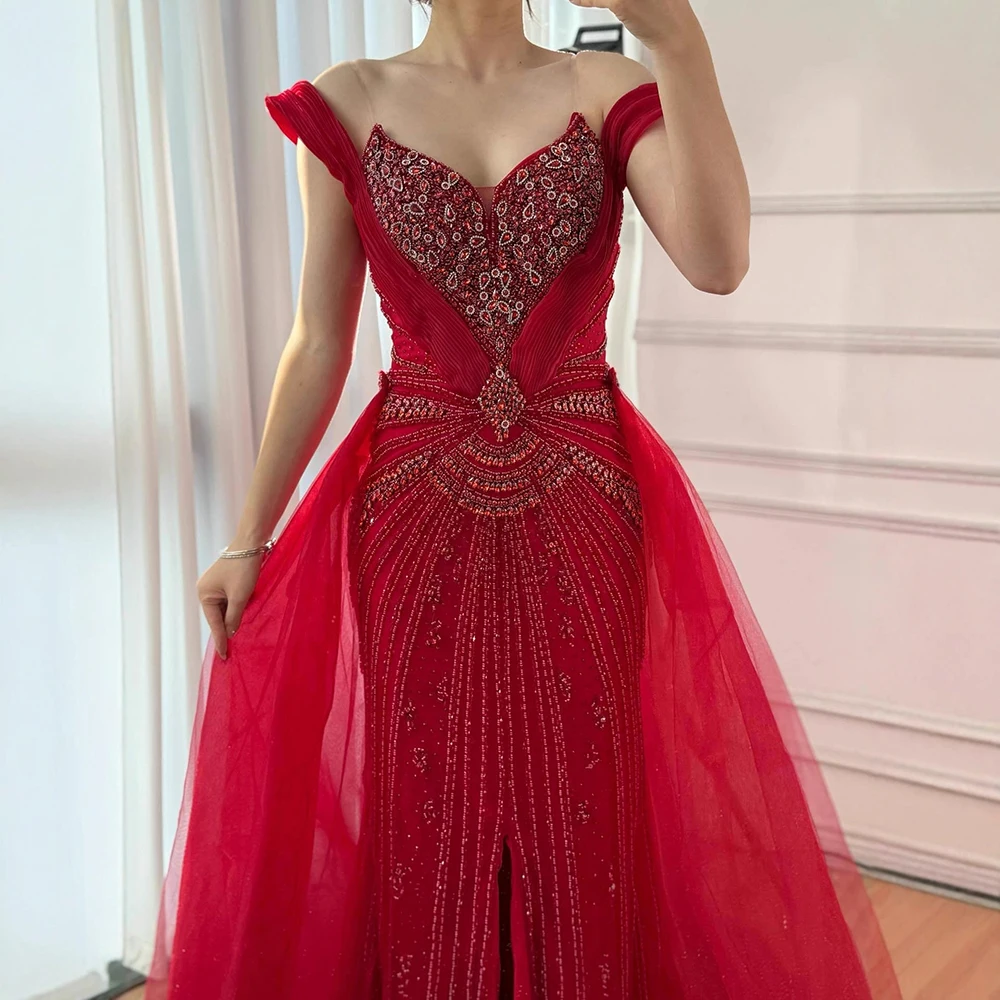 Elegant nude mermaid evening dress with sparkling beadwork, dramatic overskirt, and front slit. A refined design perfect for formal events or red carpets.