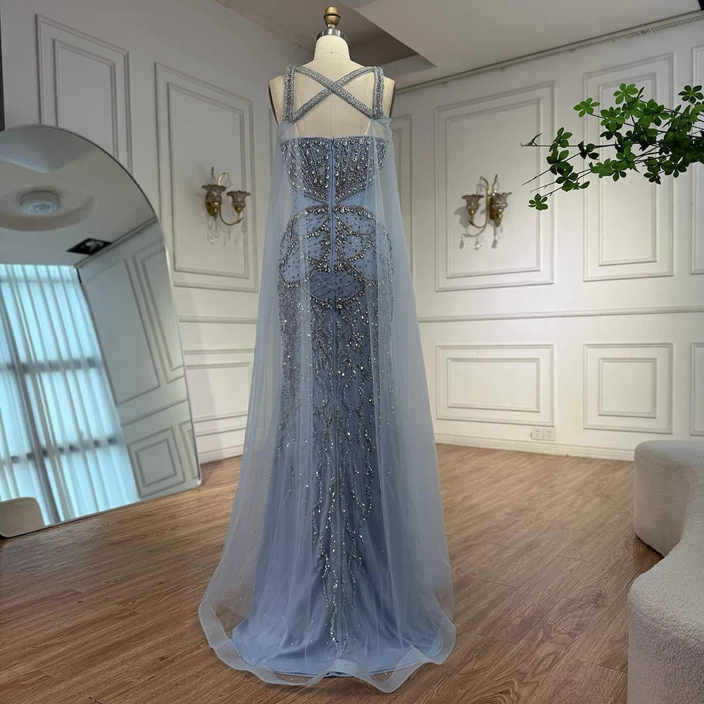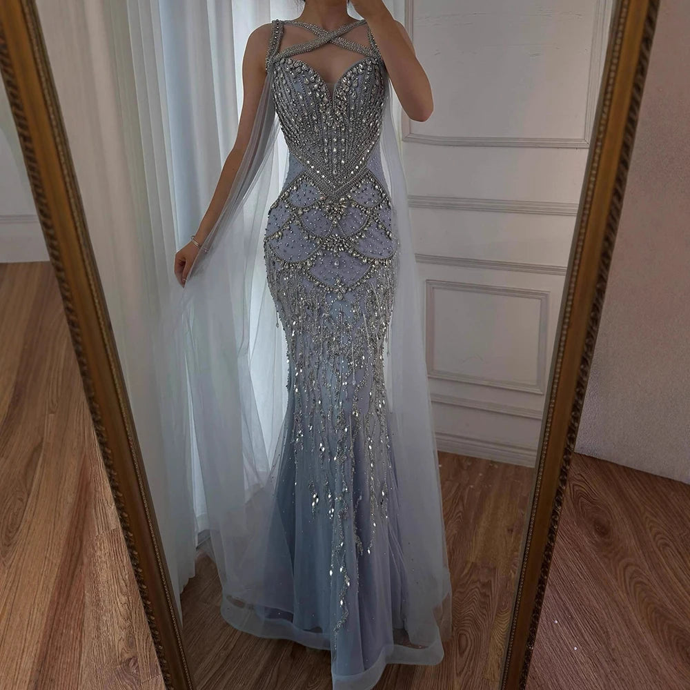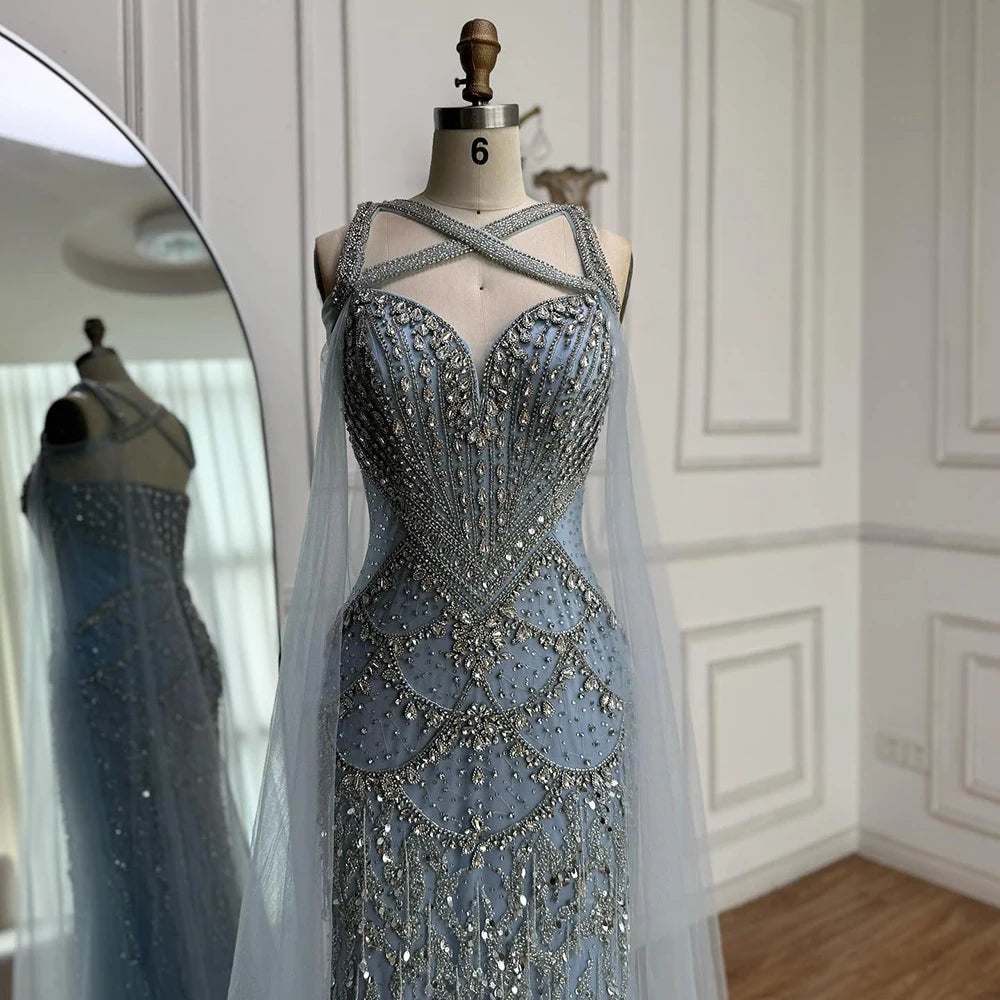 Explore luxury nude crystal beaded evening dresses with elegant cape sleeves and refined details—available in two stunning colors for formal events and celebrations.