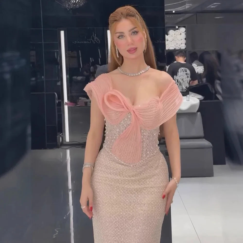 Charming pink off-shoulder mermaid evening dress with a dramatic bow and delicate beadwork. A standout gown for elegant events and formal parties.