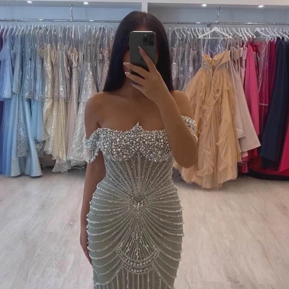 Luxury sage green pearls beaded mermaid evening dress with off-shoulder design, perfect for formal occasions, weddings, and elegant events.