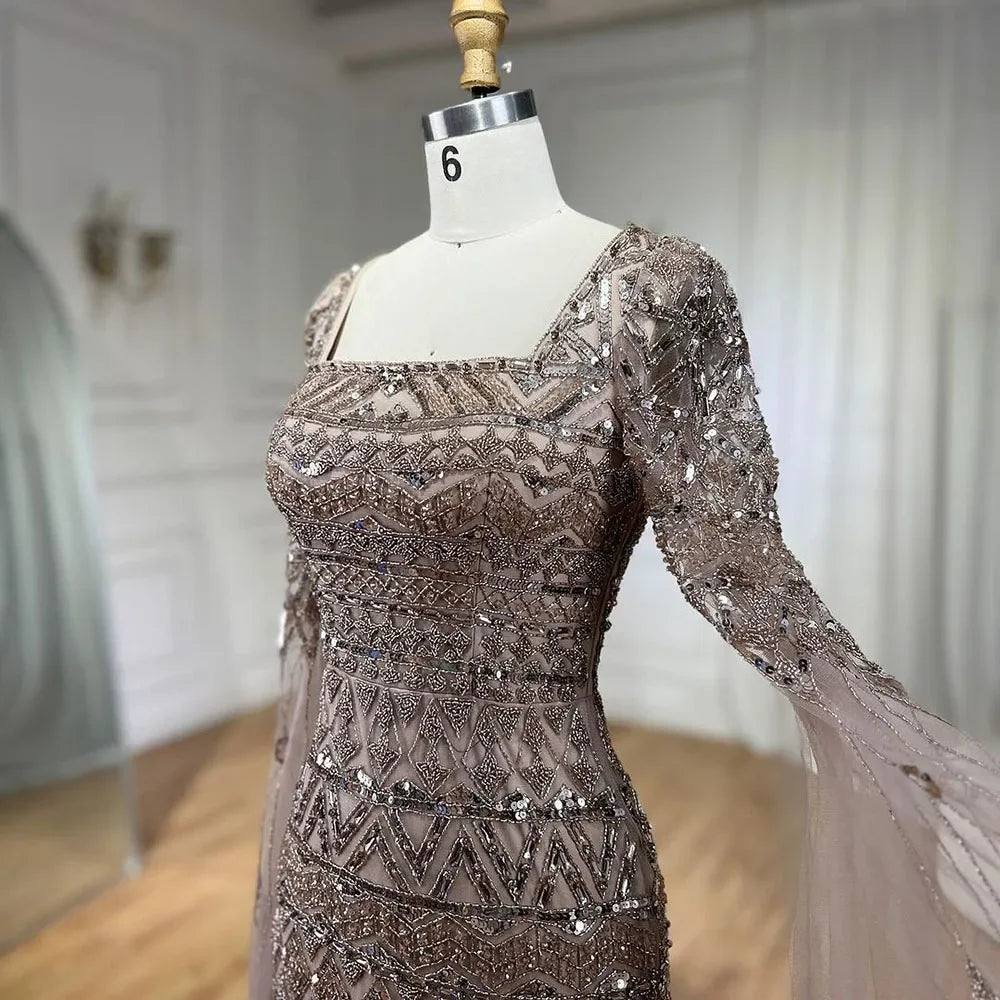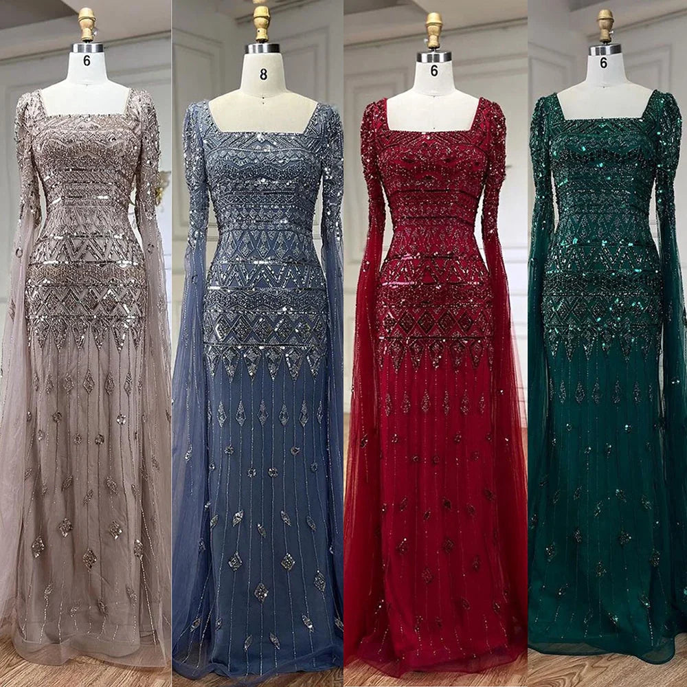 Sophisticated wine red evening dress with flowing cape sleeves and intricate beading—available in four rich color options, ideal for formal events and elegant occasions.