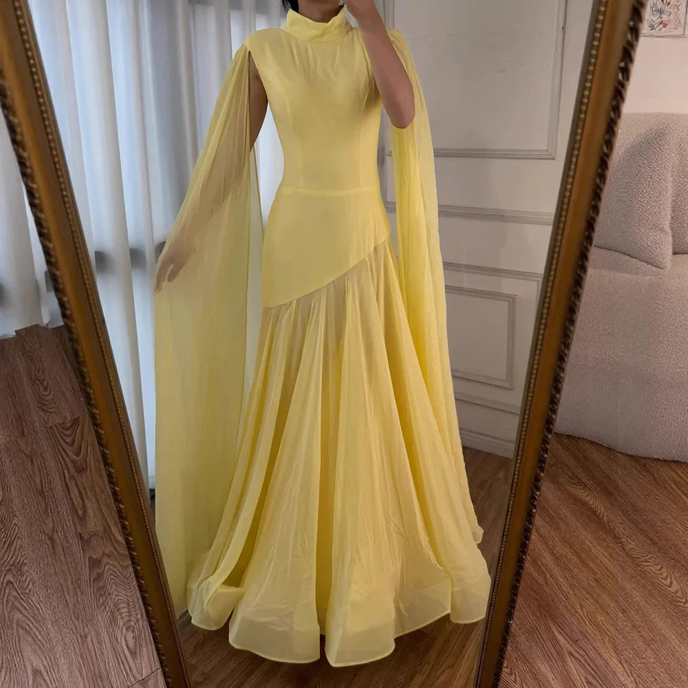 Elegant yellow chiffon A-line evening gown with high neck and flowing cape sleeves. Ideal for formal parties, weddings, or red-carpet events.