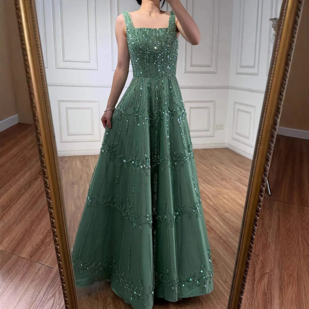 Elegant sage green A-line evening dress with delicate beading and square neckline. A graceful choice for weddings, formal events, or special occasions.