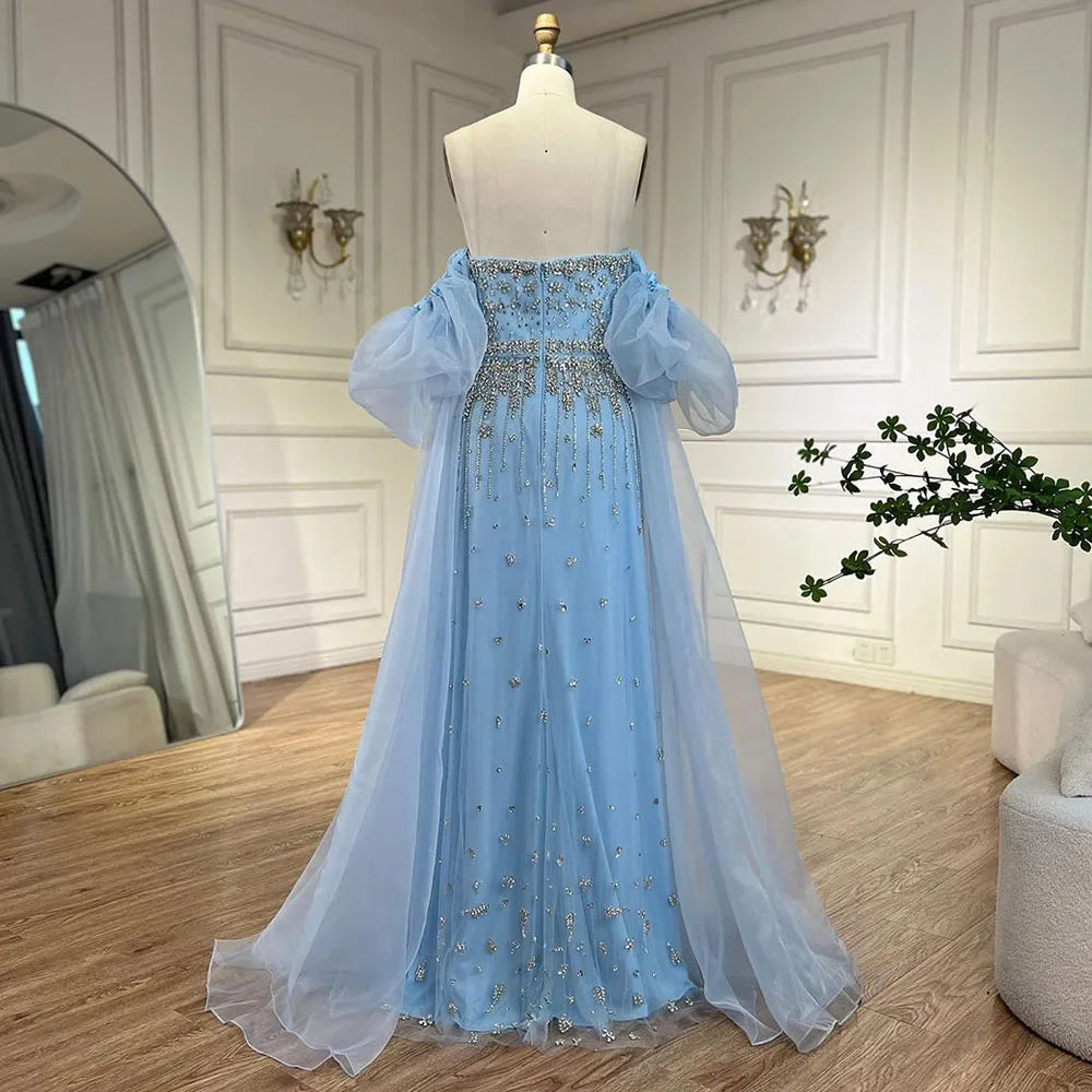Adorned with shimmering crystals and a delicate tassel detail, this dress exudes elegance and sophistication. The attached cape adds a touch of drama, perfect for any evening event. Feel confident and glamorous in this stunning piece.