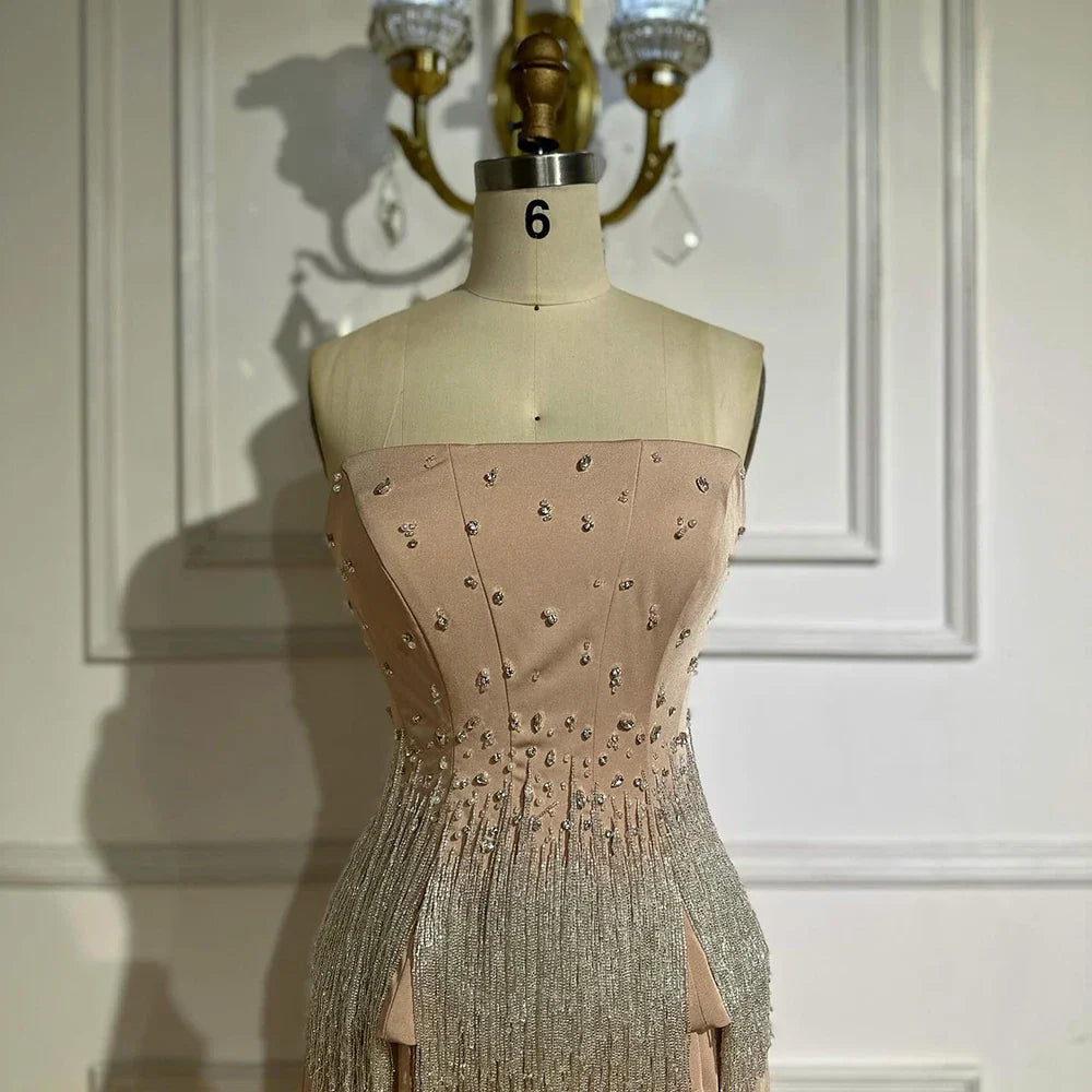 Luxury Dubai Saudi Nude Pink Arabic Mermaid Evening Dresses Gowns Beaded Tassel for Occasion LA72804