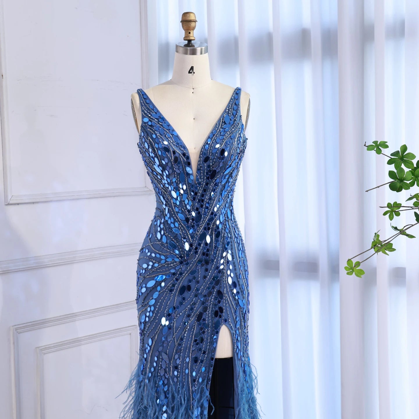 Luxury Blue Beaded Mermaid Evening Dress with Feather Details, LA73369. Elegant choice for women’s party and prom occasions.