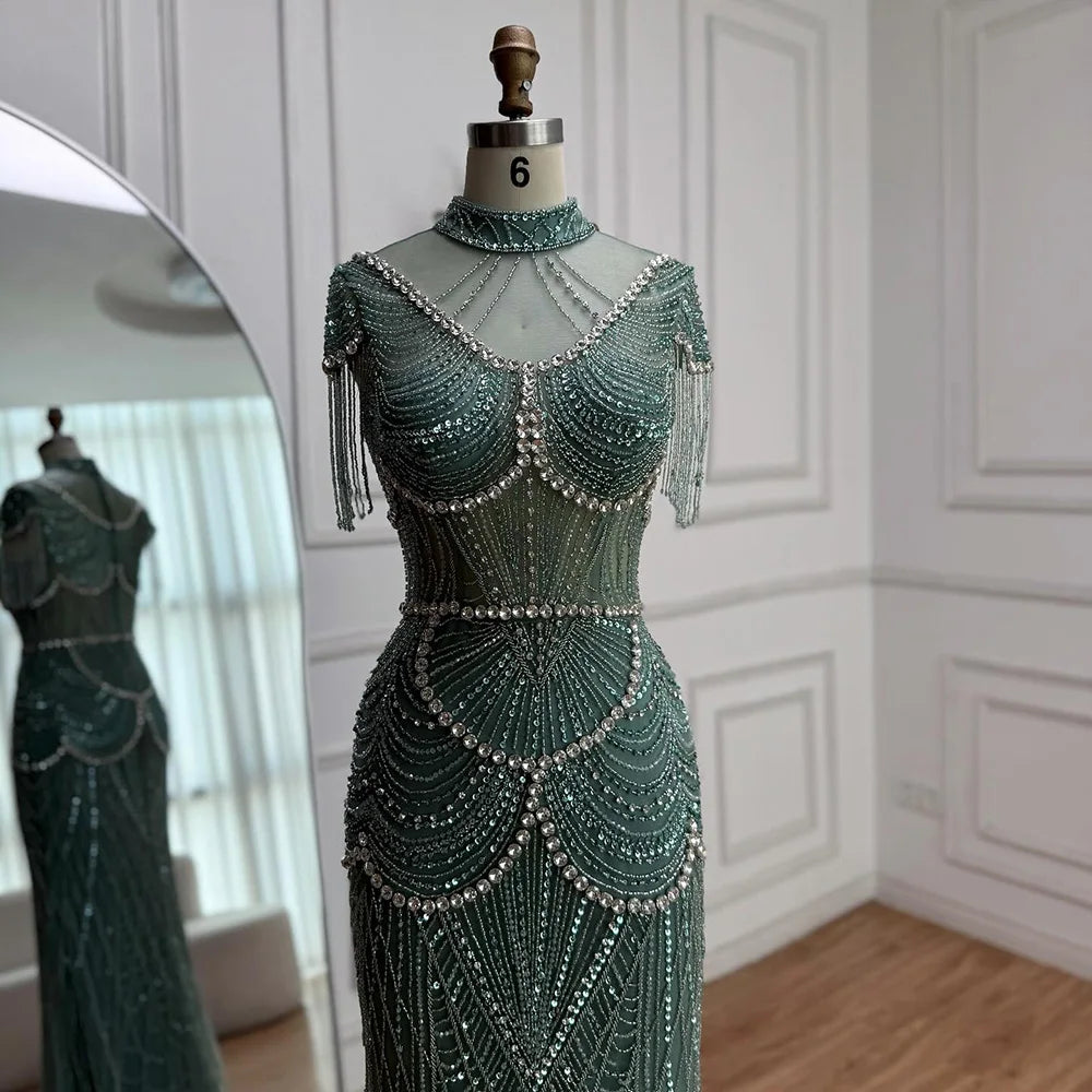 Luxury Turquoise High Neck Beaded Tassel Evening Dress for Women LA73112