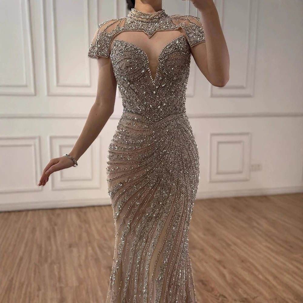 Elegant nude mermaid evening dress featuring a detachable beaded high neck and cutout design. Perfect for formal parties, galas, and red carpet events.